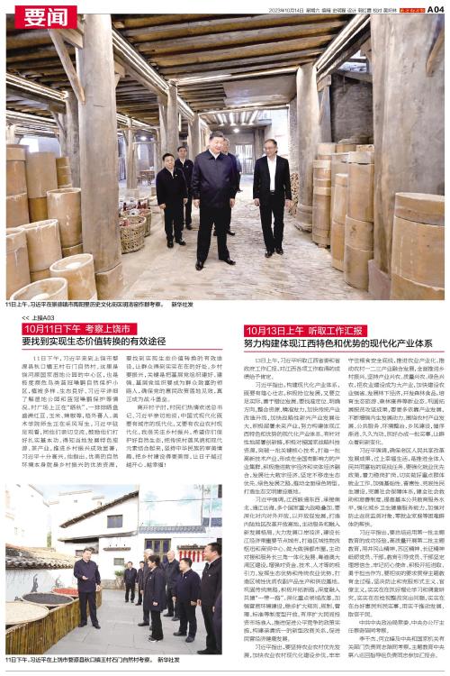 10月10日至13日,习近平在江西省委书记尹弘和省长叶建春陪同下,先后来到九江、景德镇、上饶等地,深入长江岸线、企业、历史文化街区、农村等进行调研。