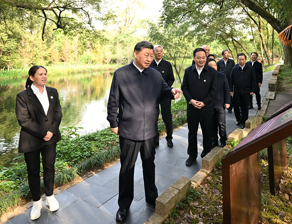 10月10日至13日,中共中央总书记、国家主席、中央军委主席习近平在江西考察。这是11日下午,习近平在上饶市婺源县秋口镇王村石门自然村考察时,了解饶河源国家湿地公园和极度濒危鸟类蓝冠噪鹛保护等情况。 新华社发