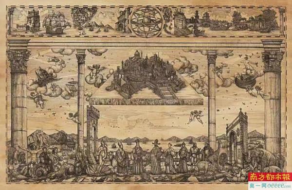 霍凯盛:代针笔,就是那些建筑师画建筑图的针笔。因为画这个线要很稳定,我用建筑师画图的针笔来绘图,因为我的画要表达那种很理性的东西。像我画文艺复兴,那个年代的时间、数学、科学,就是我喜欢的那种手工、工艺的感觉。所以就用很理性的笔触,去画那个画面。以前我们不知道对方的世界是怎么样的时候,我们可能都是透过他们的游记、出版的刊物去了解对方,了解另外一个世界。因为我的灵感很多都是来自那些文献,所以就用代针笔去模仿以前的铜版画地图,就是用现代的工具去模仿过去,也是跟过去的一个对话。