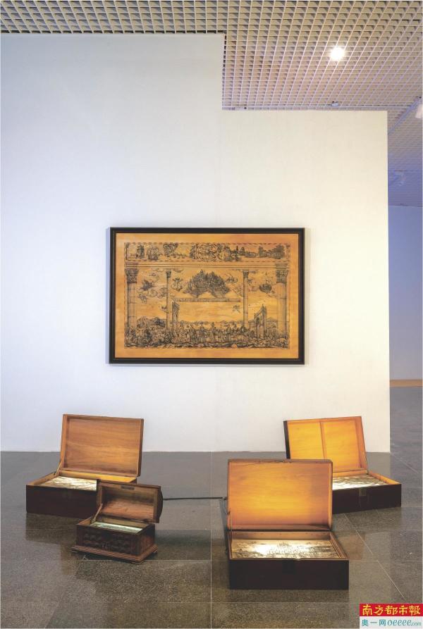 澳门青年艺术家霍凯盛的大型针笔纸本绘画《文艺复兴》在展厅正中。