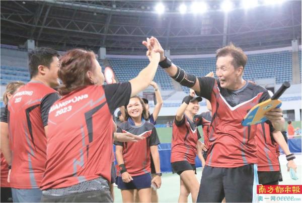 9月30日,由广州市匹克球协会承办的广东匹克球精英团体赛上,来自新加坡的选手击掌庆祝胜利。