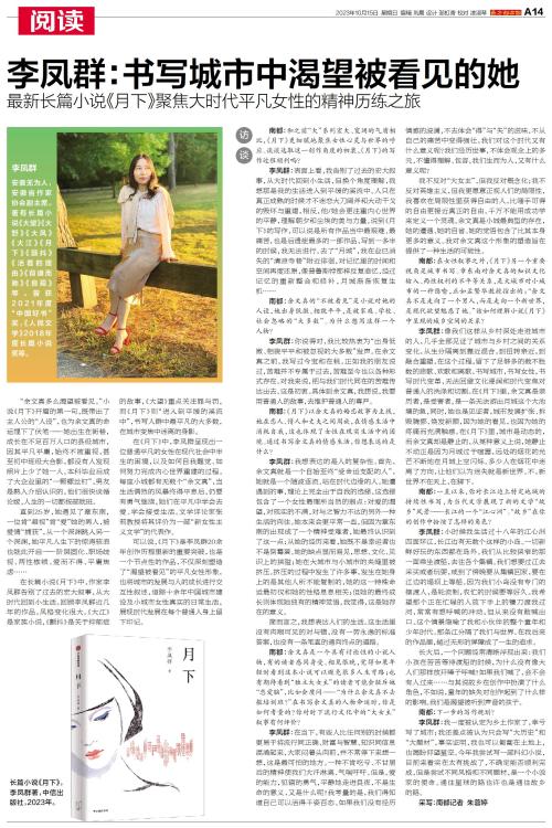 李凤群:像我们这样从乡村深处走进城市的人,几乎全部见证了城市与乡村之间的关系变化,从生分隔离到靠近混合,到扭转亲近,到融合重塑,在这个过程,留下了足够多的数不胜数的悲歌、欢歌和离歌。书写城市,书写女性,书写时代变革,无法回避文化浸润和时代变焦对普通人的洗涤和切割。在《月下》里,余文真是亲历者,是受害者,是一条无法游出月城这个大池塘的鱼,同时,她也是见证者,城市发展扩张、拆毁腾挪、焕发新颜,因为她的看见,也因为她的疼痛而充满触感。在《月下》里,城市是动态的,而余文真却是静止的,从某种意义上说,她静止不动正是因为月城过于喧嚣,远处的烟花的光芒不断地在月城上空闪烁。多少人在烟花中迷离了方向,让他们以为迷失就是新世界。不,新世界不在天上,在脚下。