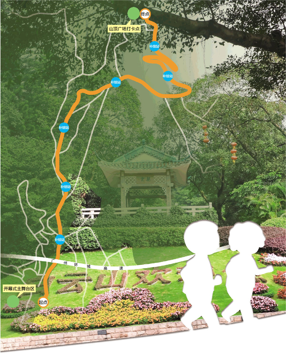 登山线 从白云山云台花园出发,沿环山公路至山顶广场打卡点,全程6公里。