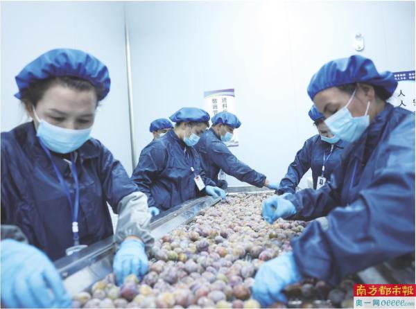 粤伽新梅产业园占地365亩,总投资3.8亿元,其中援疆资金2.2亿元,仅历时百天便建成并投入使用,集交易、分拣、保鲜、冷藏、包装、物流、研发和培训为一体,实现新梅集中收储和发货。