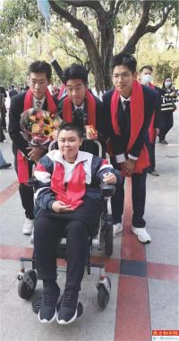 露往霜来,求学路上,何建友背着儿子爬过无数楼梯,最终抵达大学门口。
