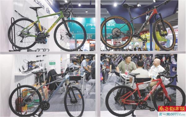 10月15日,在广交会展馆自行车展区,参展商与采购商洽谈中。 南都记者 黎湛均 摄