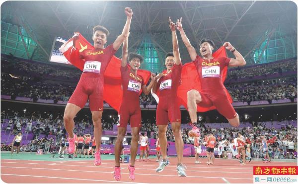 10月3日,田径项目男子4x100米接力决赛,中国选手陈冠锋(右一)、谢震业(右二)、严海滨(左一)、陈佳鹏(左二)以38秒29获得冠军。