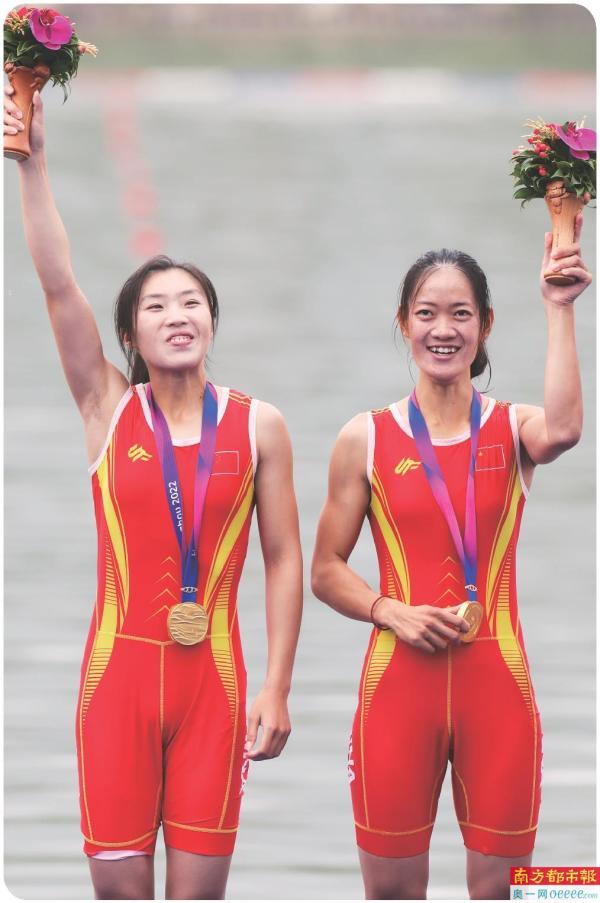 9月24日,赛艇女子轻量级双人双桨决赛,冠军中国组合邹佳琪/邱秀萍(右)斩获本届亚运会首金。