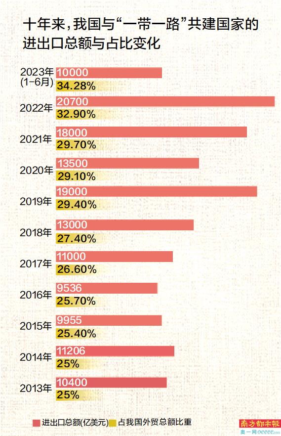 中国对“一带一路”共建国家的进出口总额翻一番;我国成为114个共建国家的前三大贸易伙伴;从 “钢铁驼队”到“丝路海运”,再到“丝路电商”……十年间,“一带一路”从愿景化为现实,以贸易畅通为保障,创造更多经贸合作新机遇,为开放型世界经济发展增添新动力。在第三届“一带一路”国际合作高峰论坛举办之际,南都大数据研究院带你数看高质量共建“一带一路”中的经贸合作累累硕果。