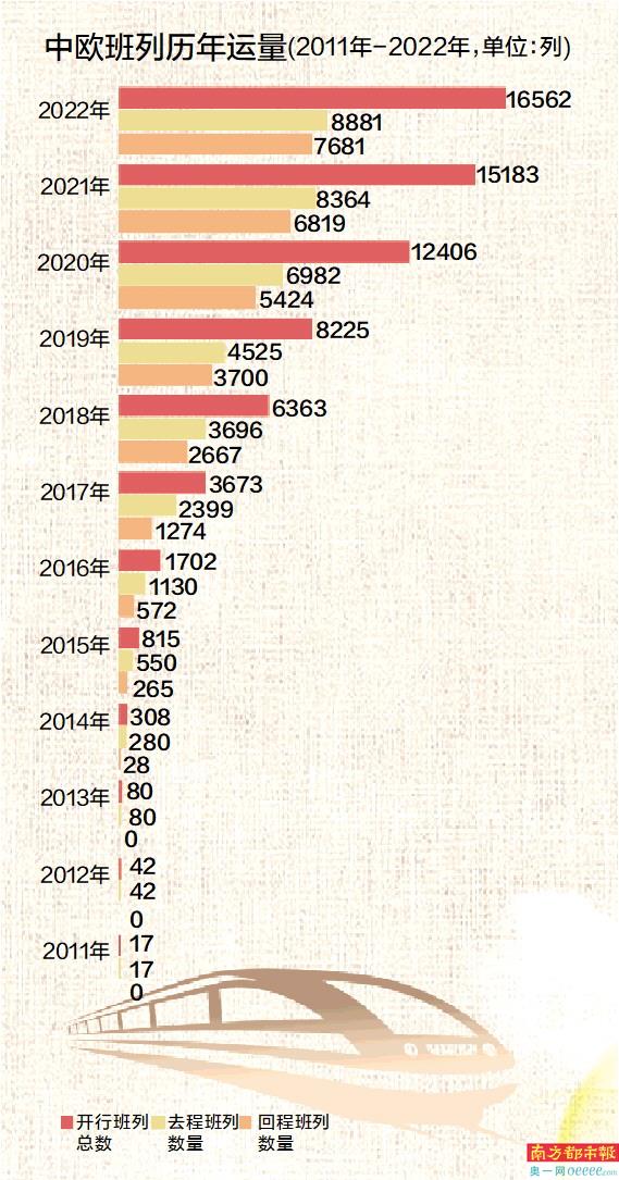2011年,第一趟中欧班列(“渝新欧”集装箱货运直达班列)开行以来,中欧班列全年开行仅17列;2020年达到12406列,是2011年的700多倍,2022年更已超过16000列。2014是中欧班列“返程”元年,回程班列20列,到2019年,仅欧洲方向班列回程就超过3000列,其中,俄罗斯方向回程988列,2022年,回程班列已达到7681列,占当年开行总数的46.38%。