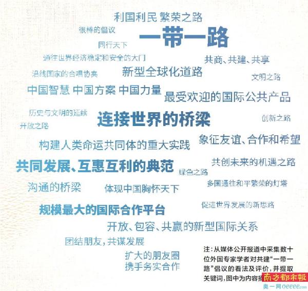 在第三届“一带一路”国际合作高峰论坛举行前夕,不少外国人士接受媒体采访,积极表达对于共建“一带一路”的关注和赞赏。南都大数据院从媒体公开报道中采集数十位外国专家学者对共建“一带一路”倡议的评价,进行语义分析发现,他们理解的“一带一路”,“桥梁”“互惠互利”“新型全球化道路”“国际合作平台”等成为高频词。更有外国学者表示,“一带一路”是各方的协奏合唱,是携手前行的阳光大道。