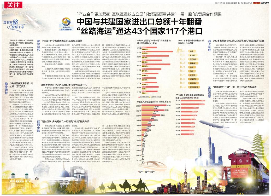 中国与共建国家进出口总额十年翻番 “丝路海运”通达43个国家117个港口