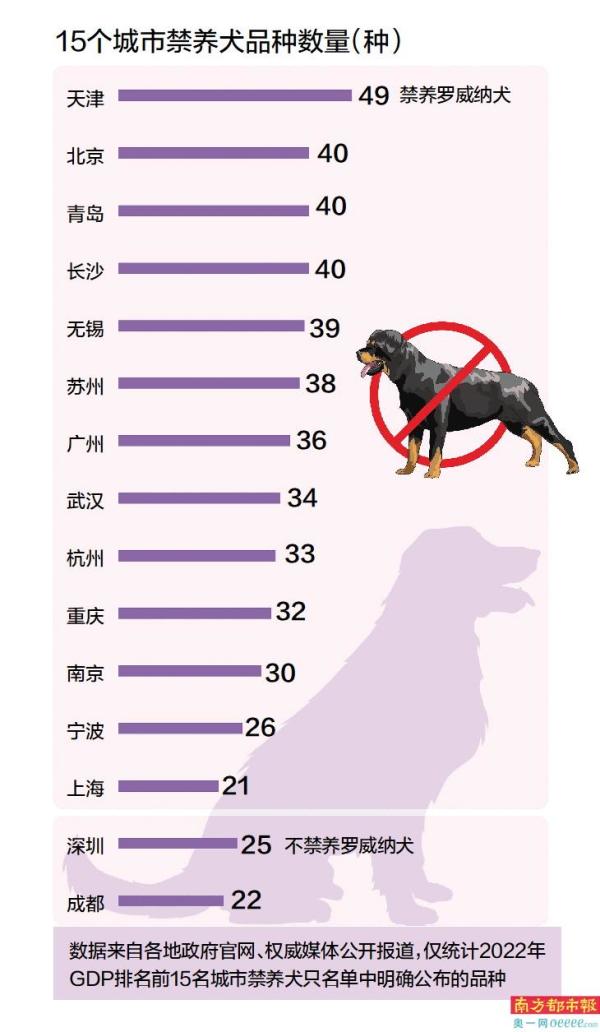 “成都女童被烈犬咬伤事件”再次引发人们对文明养犬的探讨。南都大数据研究院梳理2022年GDP排名前15名城市养犬相关管理规定、禁养犬只目录发现,各地禁养犬名单、禁养犬品种数量并不同,罗威纳犬被北京、上海、广州等城市明确列明在禁养犬名单中,而成都、深圳没有禁养。而且,多地对禁养的大型犬等肩高、体长标准也有异。