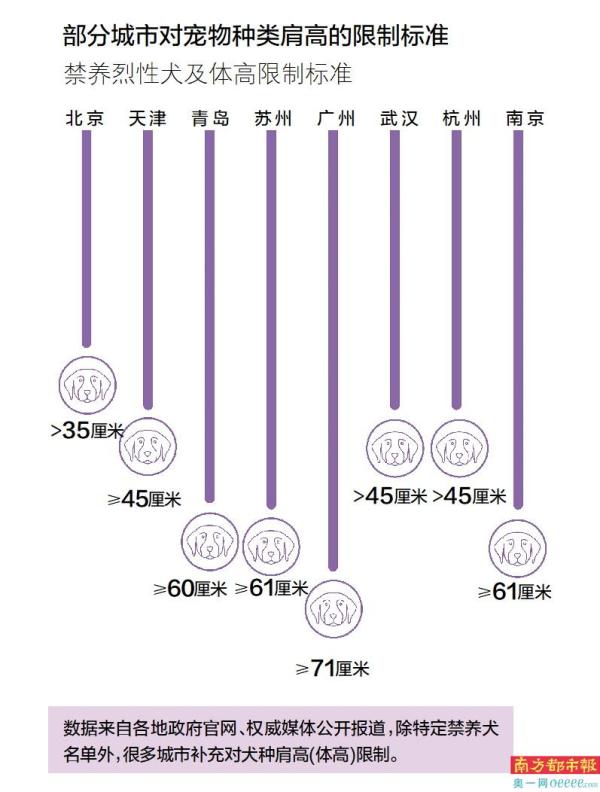 南都大数据研究院梳理发现,上述出台养犬管理条例的城市的公告可见,对禁养犬、限养犬的规定不尽相同。例如,北京规定重点管理区内原则上应饲养成年体高35厘米以下(含35厘米)的小型玩赏犬,应禁止饲养烈性犬及成年体高超过35厘米的犬种,等等。