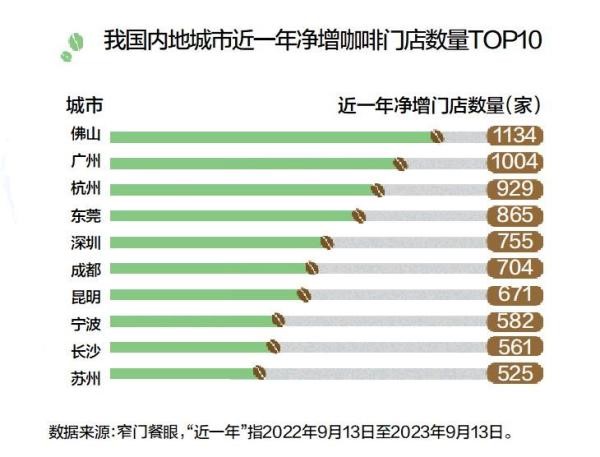 再换个角度从咖啡门店增长速度来看,也是广东独占鳌头。窄门餐眼数据显示,我国内地城市近一年净增咖啡门店数量TOP10中,广东城市占四席。其中,佛山咖啡门店净增长1134家,高居榜首;广州以净增1004家门店的成绩紧随其后。
