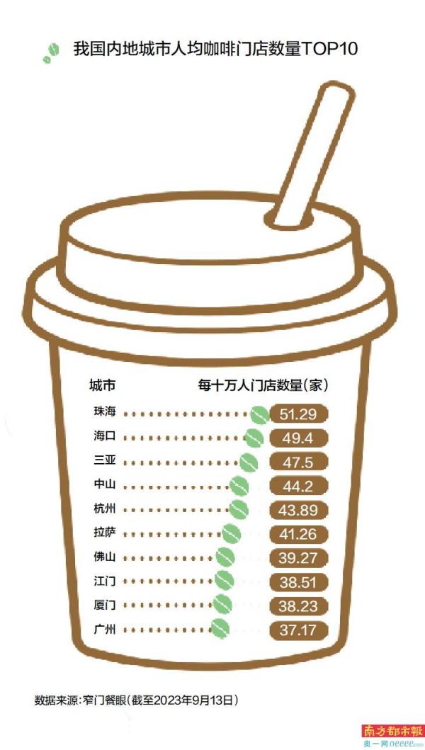有意思的是,若按人均咖啡门店数量来统计,窄门餐眼数据显示,珠海每十万人咖啡门店数量高达51.29家,在我国内地城市中居首;其次是海口(49.4家)和三亚(47.5家);广州、深圳、上海只能分列第十、十五、十六位。