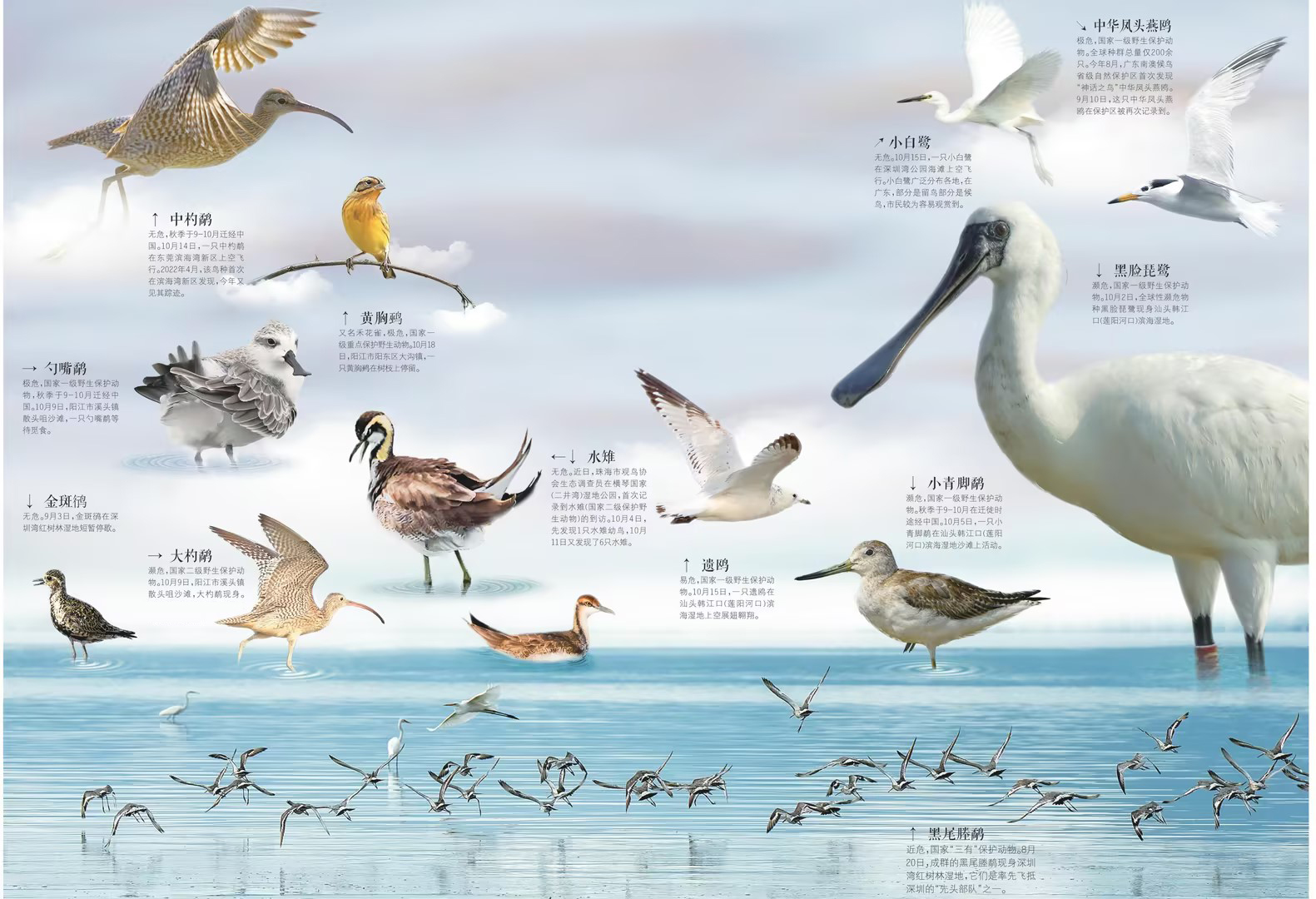 首批南迁的候鸟,飞越千山万水陆续抵粤。预计12月前后,南粤迎来候鸟迁徙高峰。随着最美观鸟季到来,爱鸟人士除了欣赏到“万鸟齐飞,候鸟欢歌”的壮观景象,还将有机会碰到那些难得一见的珍稀鸟类。