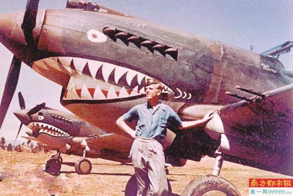 二战时期昆明巫家坝机场,一名飞虎队队员在涂装有“鲨鱼嘴”标志的战斗机前留影的资料照片。新华社发