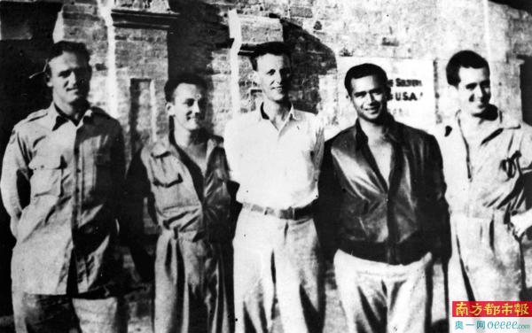 二战期间,被新四军营救的5名美国飞虎队飞行员在新四军驻地合影。新华社发