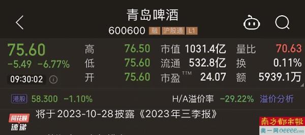 同日,青岛啤酒股份有限公司在开盘前发布公告称,公司生产经营情况一切正常。青岛啤酒竞价期间一度触及跌停,开盘跌6.77%报75.60元/股,盘中最低跌至75元/股,股价创下自2022年5月10日以来的新低。截至收盘,青岛啤酒跌幅收窄,最终收跌0.37%,报80.79元/股,A股总市值572.93亿元。
