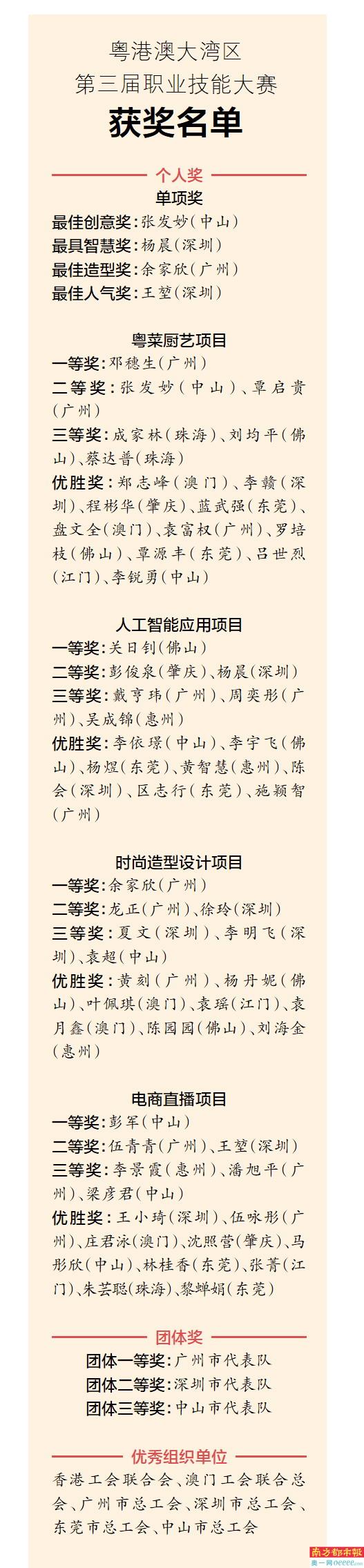 10月24日,广东省总工会、香港工会联合会、澳门工会联合总会主办,广州市总工会承办的粤港澳大湾区第三届职业技能大赛闭幕式在广州白云国际会议中心举行,各项目竞赛结果正式公布。