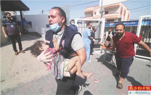 10月23日,在加沙地带南部城市拉法,人们将受伤的儿童送往医院。