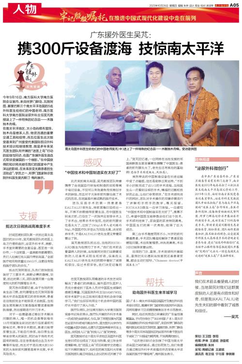 南太岛国外科医生给他们的中国老师吴芃(中)送上了一件特殊的纪念品——木雕独木舟楫。