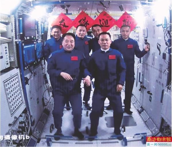 在载人飞船与空间站组合体成功实现自主快速交会对接后,神舟十七号航天员乘组从飞船返回舱进入轨道舱。10月26日19时34分,神舟十六号航天员乘组顺利打开“家门”,欢迎远道而来的神舟十七号航天员乘组入驻“天宫”。随后,两个航天员乘组在空间站拍下了6张“全家福”,共同向全国人民报平安。