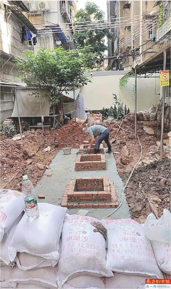 近日,南都记者来到得胜岗15号看到,因施工被挖开的空地已经恢复原样。而102号房的房门打开,门前拉起了施工隔离线。得胜社区党委书记黄芝良表示,102号房正在翻新家里的厨房。他指着房间里的防汛沙袋说,“这是以前他自己买的,用来防止污水进入客厅。”