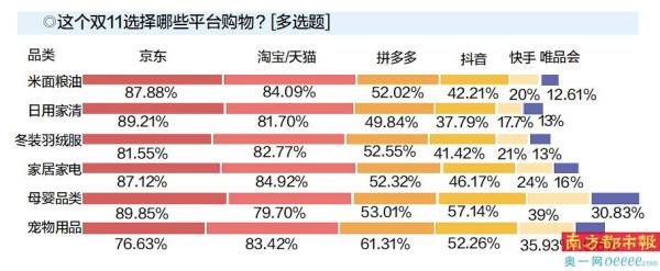 综合调研发现,购买米面粮油品类时,87.88%的消费者首选京东平台,其次是淘宝/天猫(84.09%)、拼多多(52.02%)。购买冬装羽绒服品类时,82.77%消费者首选淘宝/天猫,京东以81.55%紧追其后;购买家居家电品类时,87.12%消费者首选京东,其次是淘宝/天猫(84.92%)、拼多多(52.32%)。由此反映出“品质保障的加持”使京东成为大部分人的首选。