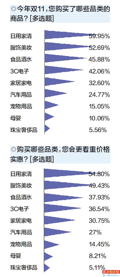 一年一度的双十一正进入销售高峰期。南都近日发起的品类消费调研数据显示,日用家清、服饰美妆类商品的购买需求最大,消费者在购买这些品类时更看重价格实惠。从消费偏好来看,85.14%的受访者认为自己属于理性消费型,自认是冲动消费型的受访者占14.86%。