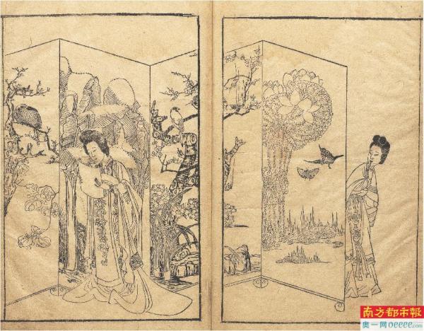 此次展出的《张深之先生正北西厢秘本》(中国国家图书馆藏)的插图由陈洪绶所绘,是陈洪绶的版画代表作。其中“窥柬”一图最为精彩:读柬的莺莺喜中带羞、仪态可人;偷看的红娘更是天真烂漫、稚趣十足;而作为背景的屏风则充分展示了陈洪绶在花鸟画方面的功力。整幅画面构成一个生动活泼的有机整体,是中国古代版画的经典之作。