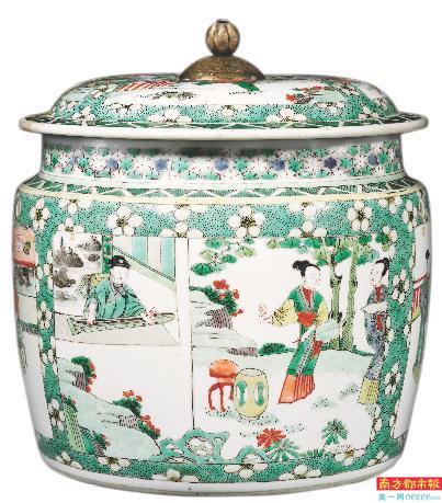 清 康熙五彩开光《西厢记》人物图盖缸,故宫博物院藏。