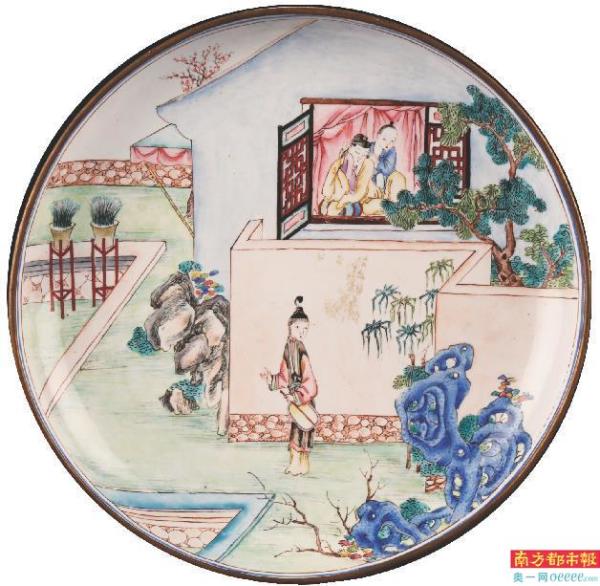清 铜胎画珐琅《西厢记》“锦字传情”图盘,广东省博物馆藏。