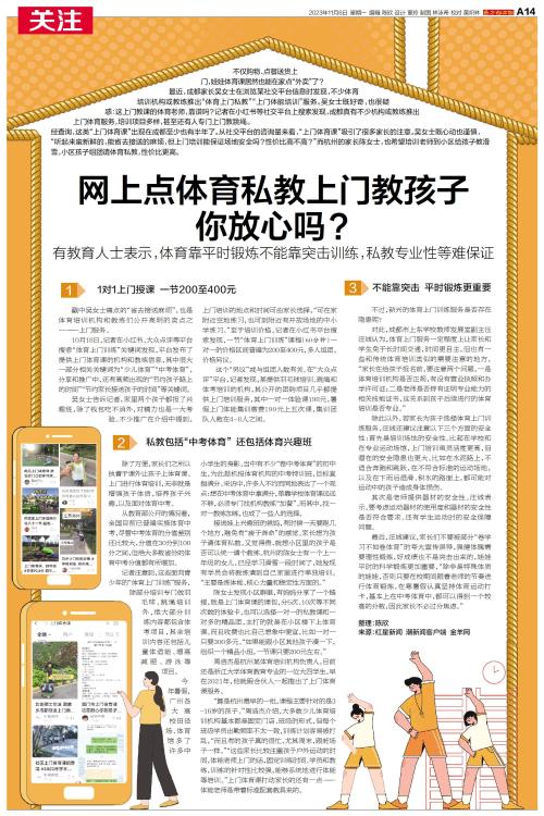 对此,成都市上东学校教师发展室副主任汪诚认为,体育上门服务一定程度上让家长和学生免于长时间交通,时间更自主,但也有一些和传统体育培训类似的需要注意的地方,“家长在给孩子报名前,要注意两个问题,一是体育培训机构是否正规,有没有营业执照和办学许可证;二是老师是否持有证明专业能力的相关技能证书,这关系到孩子后续进行的体育培训是否专业。”