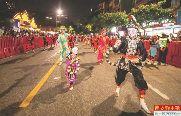 时隔三年,以主题为“品味佛山·秋醉岭南”的2023年广东非遗周暨佛山秋色巡游活动于11月4日晚在佛山启动。璀璨夺目的彩灯彩车、生动活泼的舞狮舞龙、美妙绝伦的飘色……将佛山的秋天之美绘入画卷,擦亮岭南文化大市品牌名片。