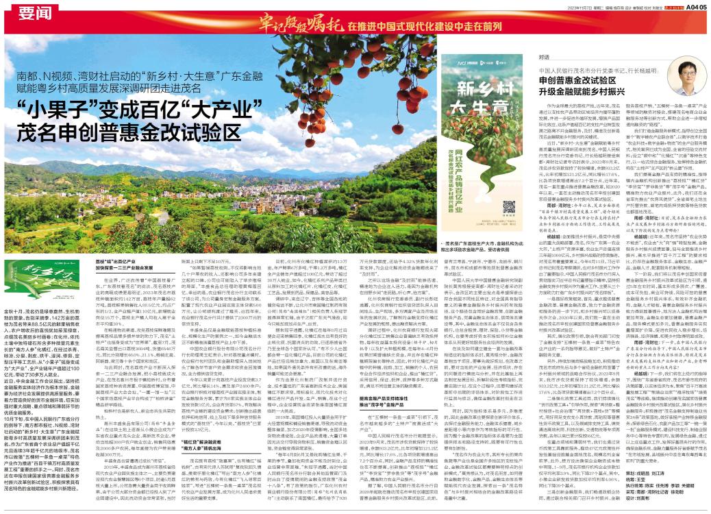 10月下旬,在中国人民银行广东省分行的指导下,南方都市报社、N视频、湾财社启动的“新乡村·大生意”广东金融赋能粤乡村高质量发展深调研团来到茂名。