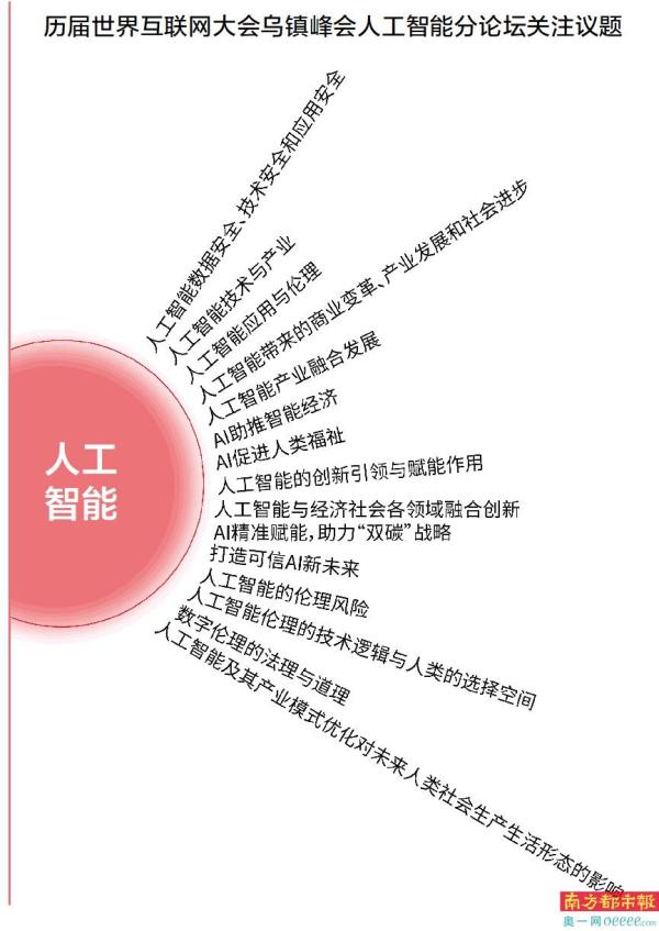 还有聚焦伦理与智能经济的讨论。第六届世界互联网大会人工智能分论坛,以“开启智能经济新时代”为主题,聚焦数据驱动、人机协同、跨界融合、共创分享的智能经济形态,第九届世界互联网大会人工智能与数字伦理分论坛以“人工智能的产业方向与伦理取向”为主题,分别探讨了:人工智能伦理的技术逻辑与人类的选择空间;数字伦理的法理与道理——现实世界与数字世界交融的秩序与规则;人工智能及其产业模式优化对未来人类社会生产生活形态的影响。