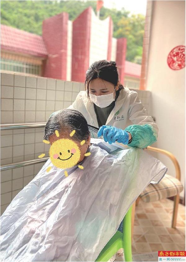 张小梅帮一位婆婆剪头发。