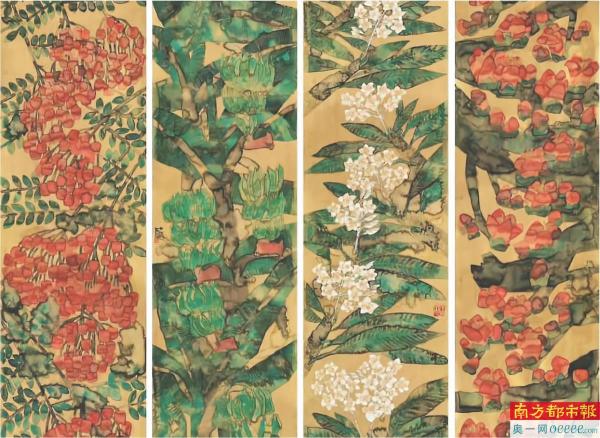 林蓝画作:《岭南风情——木棉 芭蕉 鸡蛋花 荔枝》。