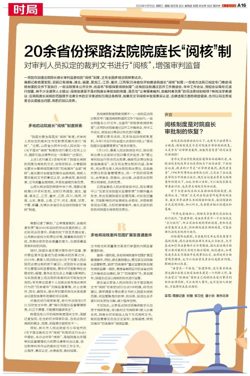 南都记者梳理发现,目前已有湖南、湖北、福建、黑龙江、江苏、重庆、江西等20余省份开始推进院庭长“阅核”制度;一些地方法院已制定专门推进阅核制度的文件下发执行,一些法院暂未公开文件,也宣布“积极探索阅核制度”;还有的法院通过召开工作推进会、年中工作会议、党组会议等形式进行部署。有不少法律界人士提出:阅核制度是不是对院庭长审批制的恢复,是否与“让审理者裁判、由裁判者负责”的司法责任制相悖?有刑法学者建议:应将院庭长阅核的范围限于法律文书的文字表述和引用法条两项,如果在文字阅核中发现事实认定、法律适用方面有明显错误,也可以向法官或者合议庭提出问题,斟酌后加以改善。