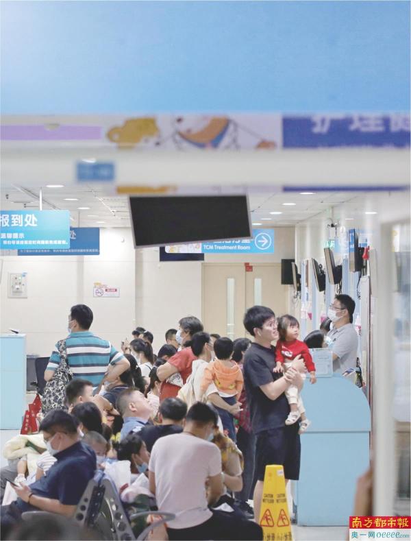 近日,广州市妇女儿童医疗中心珠江新城院区,儿内科、中医儿科诊室外挤满了候诊的孩子和家长。 南都记者 梁炜培 摄