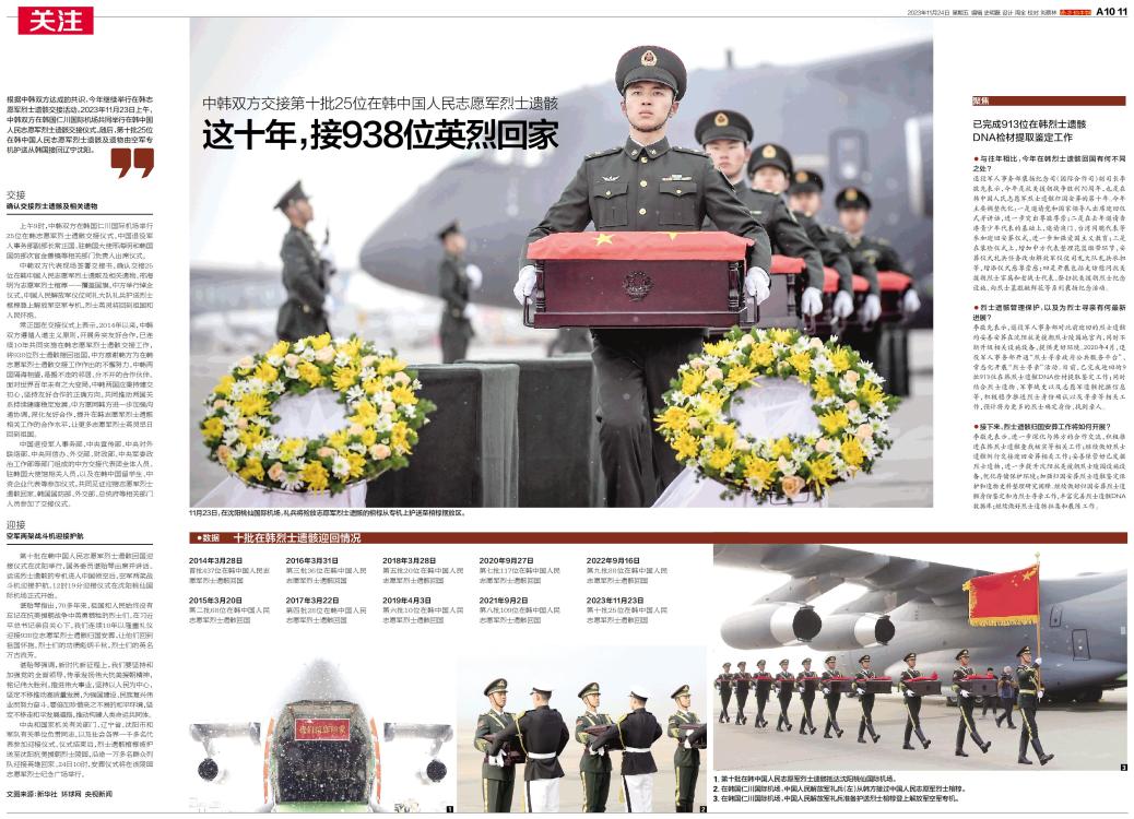 根据中韩双方达成的共识,今年继续举行在韩志愿军烈士遗骸交接活动。2023年11月23日上午,中韩双方在韩国仁川国际机场共同举行在韩中国人民志愿军烈士遗骸交接仪式。随后,第十批25位在韩中国人民志愿军烈士遗骸及遗物由空军专机护送从韩国接回辽宁沈阳。