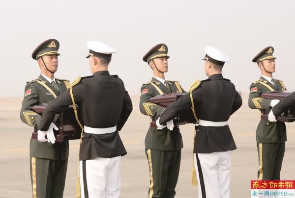 在韩国仁川国际机场,中国人民解放军礼兵(左)从韩方接过中国人民志愿军烈士棺椁。