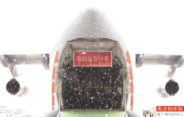 11月23日,在沈阳桃仙国际机场,礼兵将殓放志愿军烈士遗骸的棺椁从专机上护送至棺椁摆放区。