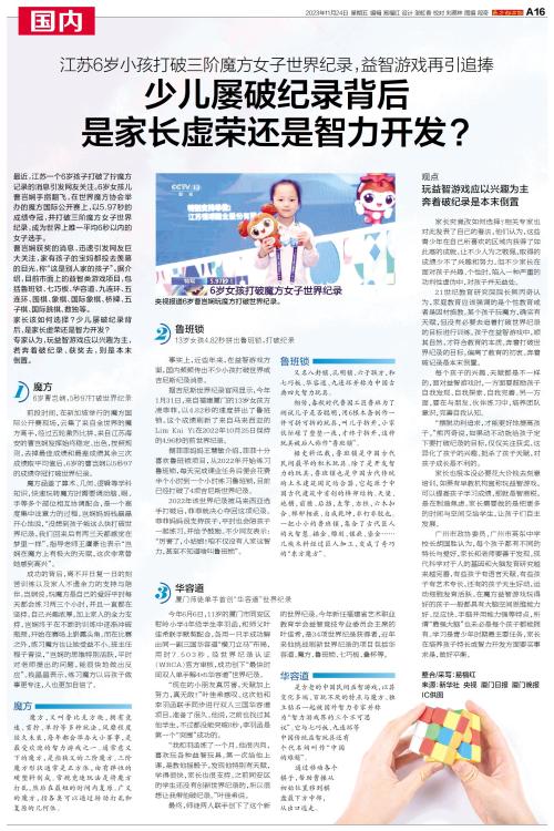 最近,江苏一个6岁孩子打破了拧魔方记录的消息引发网友关注。
