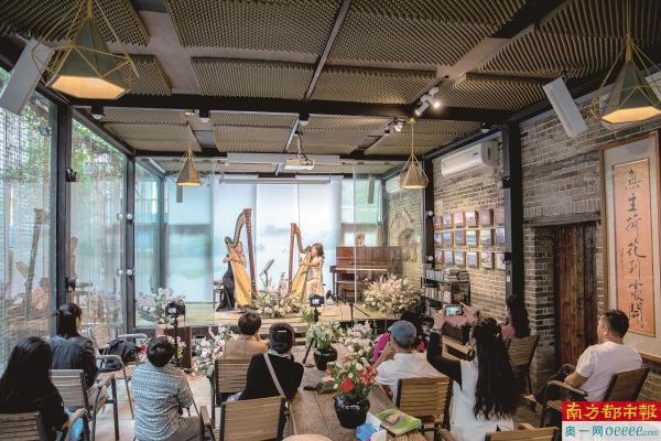 而位于花都区花山镇洛场村的月上海棠音乐民宿,由一间民国时候保存下来的特色碉楼改建而成,总面积超450平方米。青砖老院屋台青瓦,入门后的温室花园的上方是玻璃顶,仰头就能望见天空。夜里灯火阑珊、天气晴朗的时候,可坐在院子里、天井中、阳台上喝茶谈心,数星星,看月亮。但音乐才是这家民宿最大的特色,客厅里面有一个舞台,舞台上有一架极具古典气质的竖琴,民宿主人经常会在这里举办音乐会。