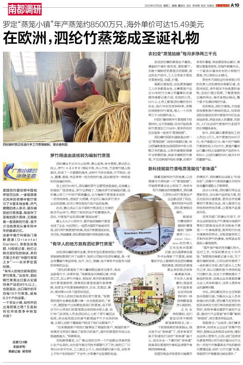 “有华人的地方就有泗纶罗竹蒸笼。”近些年,泗纶镇竹蒸笼出口量占全国同类产品的85%以上。也就是说,出口海外的平均每10个竹蒸笼,就有8.5个产自这里。