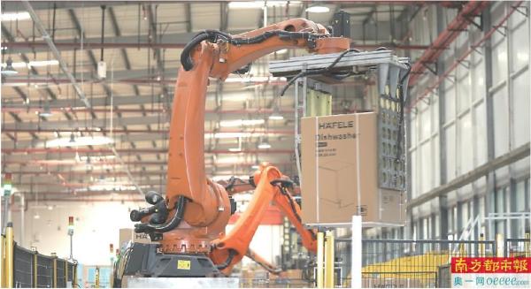 为适应不同的工作需求,美的也会使用不同吨位的机器人,例如在最需力量的套装运输工位,一台台负载超过340公斤的重载机器人,正替代人工,进行24小时的无间断搬运。