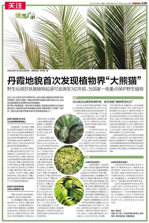 近日,中山大学生命科学学院科考人员在丹霞山国家级自然保护区科学考察时,发现了国家一级重点保护野生植物仙湖苏铁的分布。这也是丹霞地貌首次发现野生的苏铁属植物。
